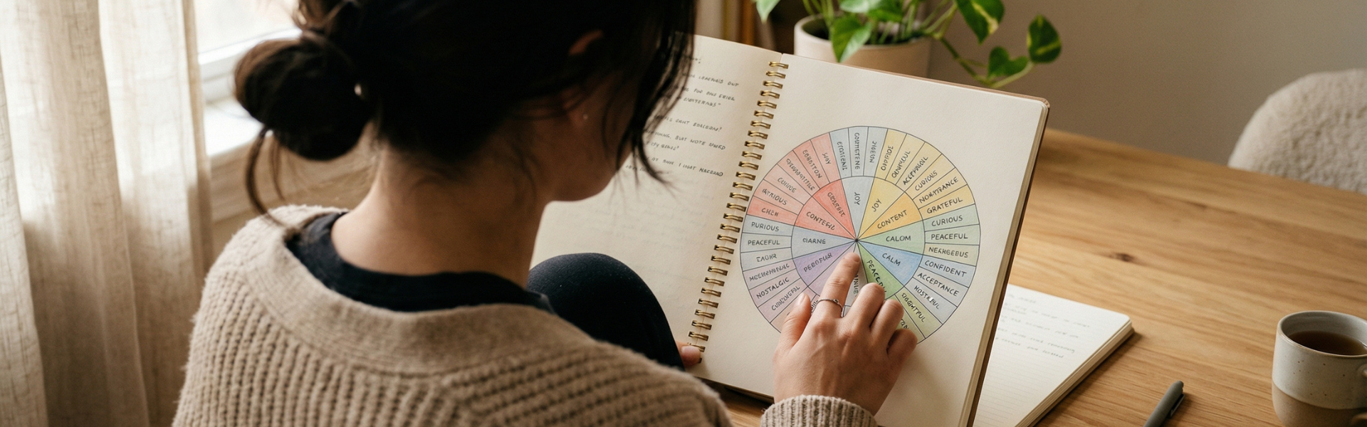 An emotion wheel is a visual tool designed to help you identify and name what you are feeling. For many adults, emotions can feel vague or overwhelming. The wheel provides language and clarity.
